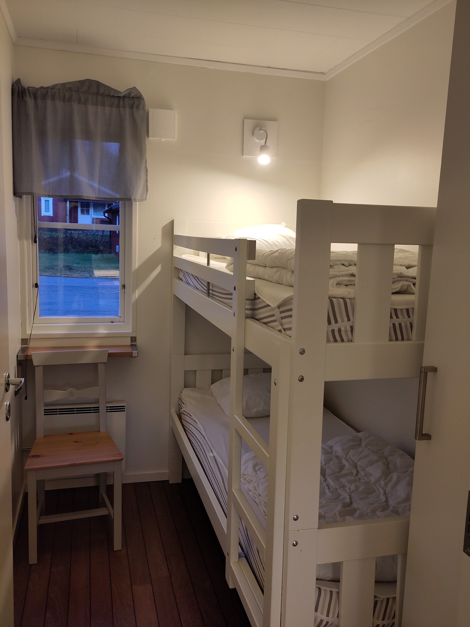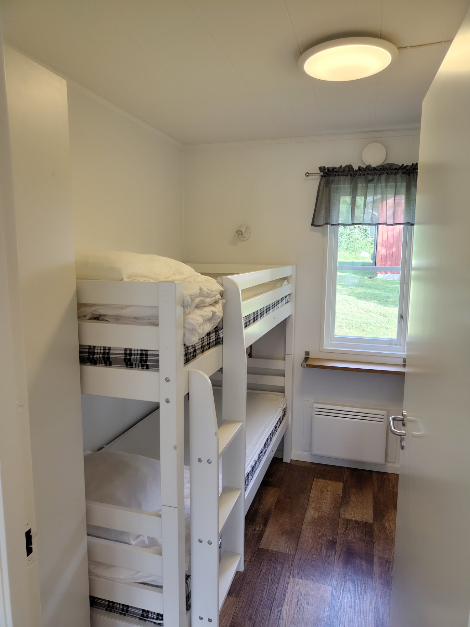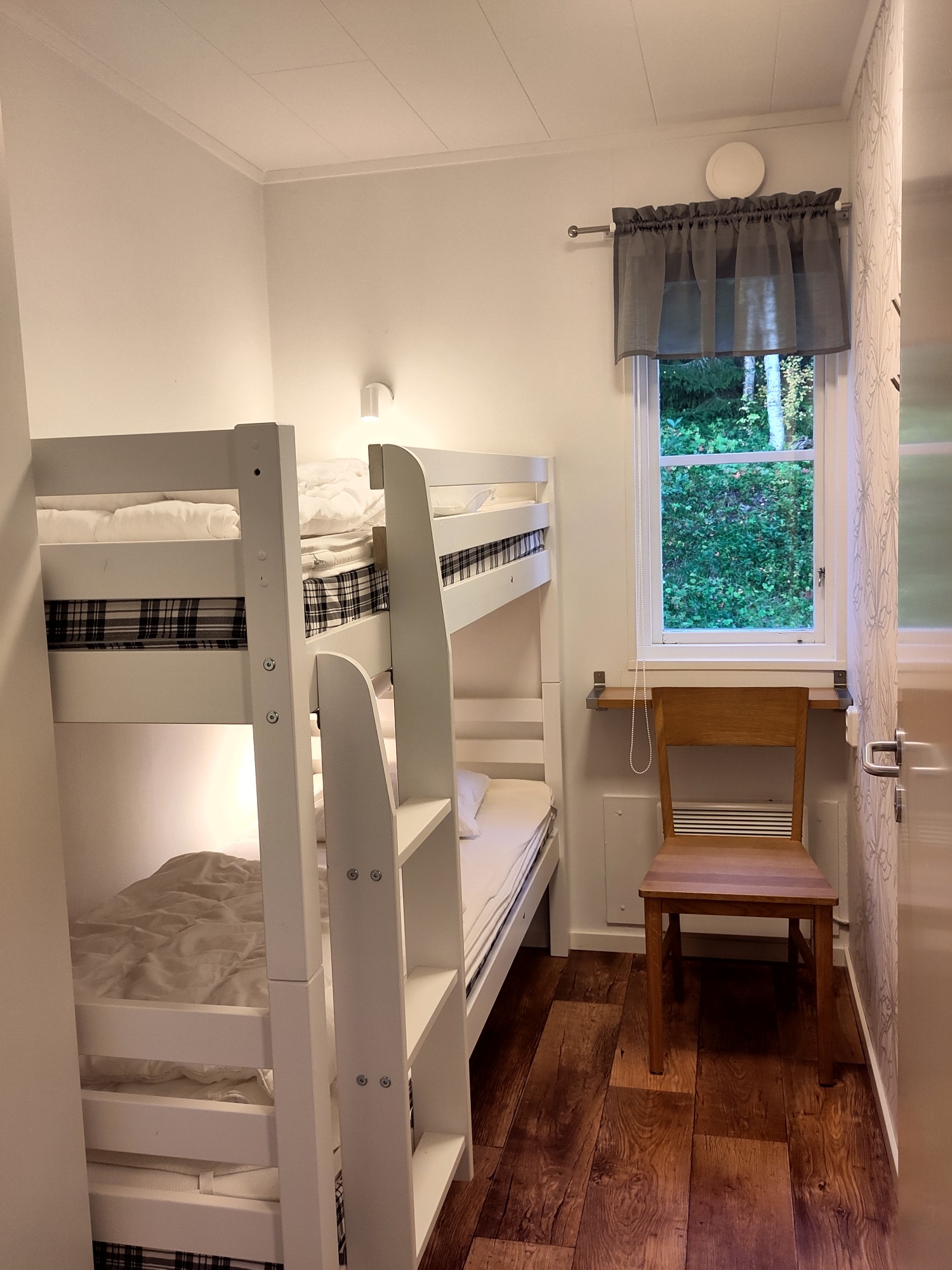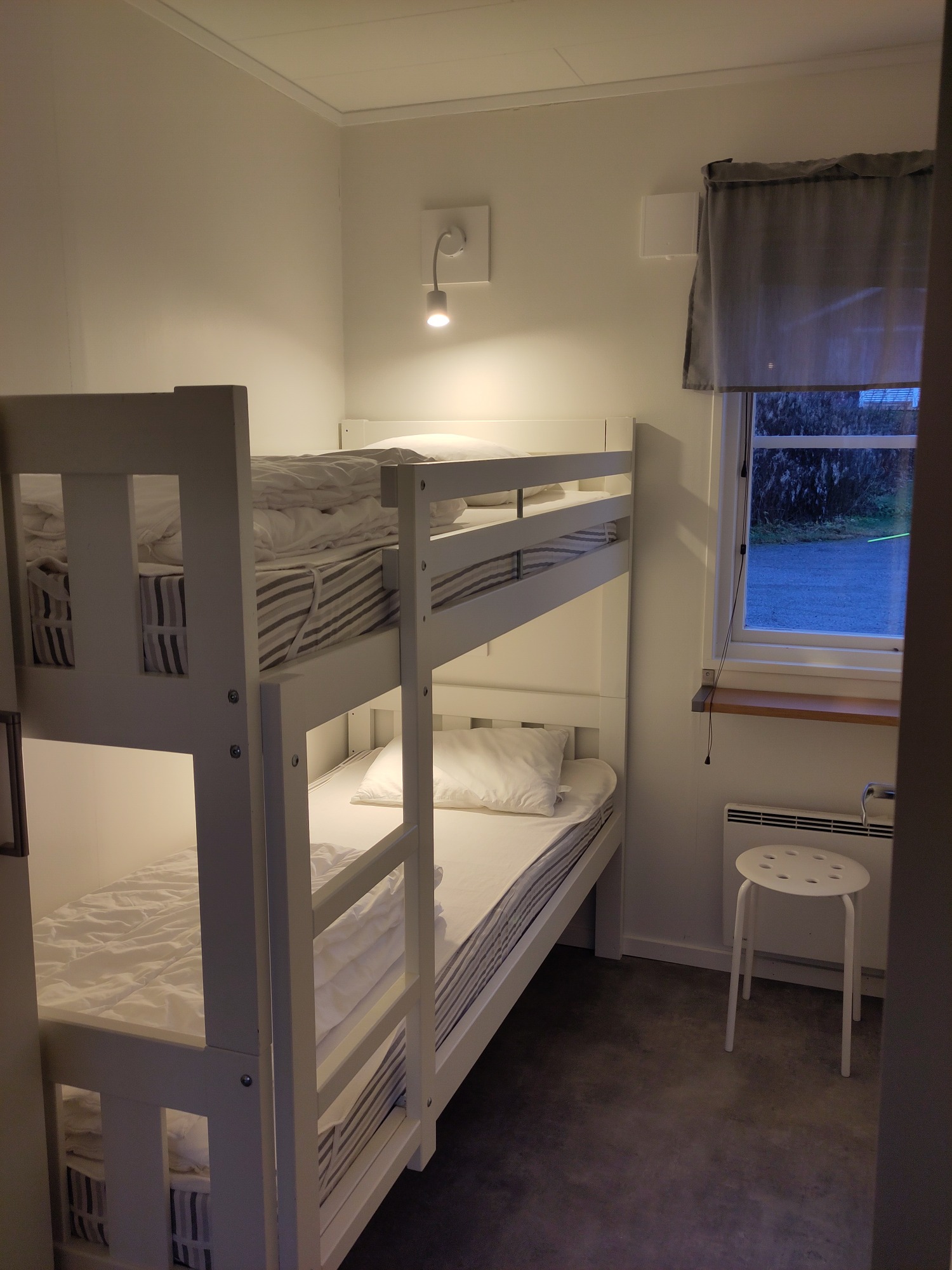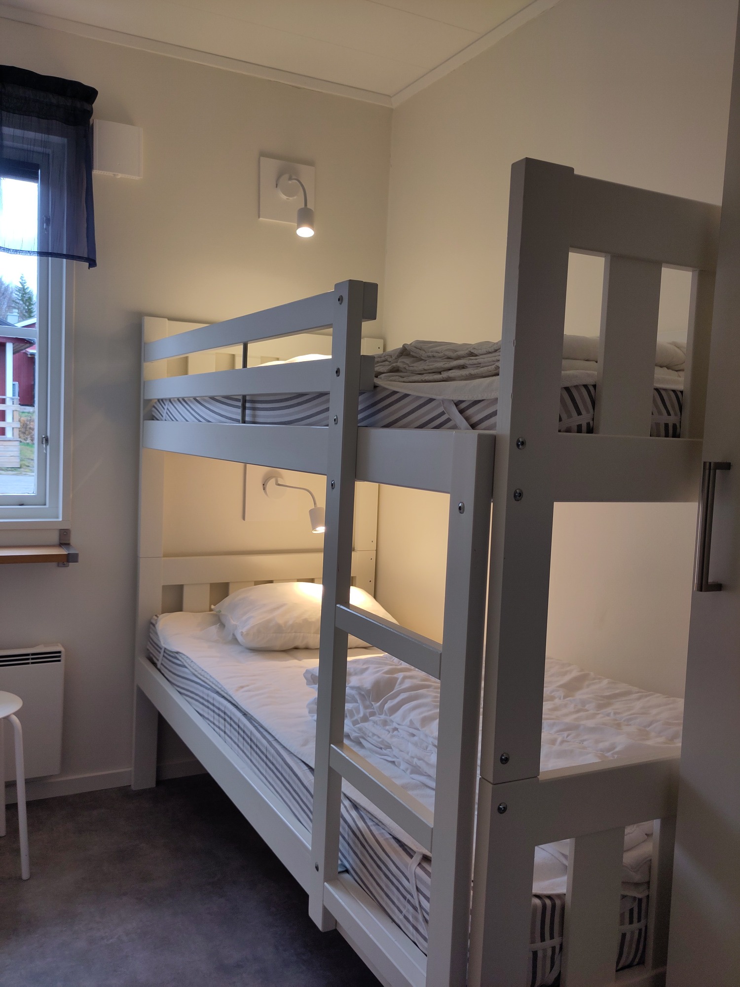 Här nedan kan du se bilder från våra stugor och lägenheter. Alla stugor har torkskåp i hallen, fullt utrustade kök med halv kyl och halv frys, ett badrum/toalett med dusch, tre sovrum (ett sovrum med två enkelsängar och två sovrum med en våningssäng i varje), matgrupp, soffgrupp och tv. Samtliga stugor och lägenheter är 46 kvm stora och ligger i markplan (obs att stuga 10 har en liten "backe" upp samt att stuga 12 har några trappsteg upp utomhus från parkeringen). Motorvärmaruttag finns på samtliga stugor (EJ för laddning av elbil!) och 16 och 38 har elbilsladdare (200 SEK/vistelse).